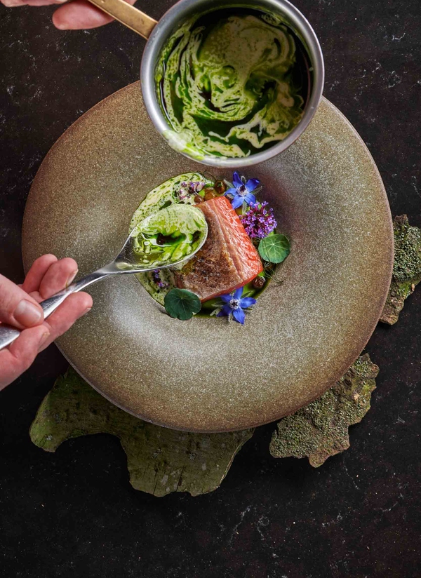 Honningfermentert rabarbra, jordskokkpuré, lardo